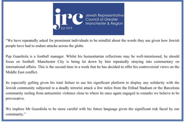 February 5, 2026 Posted By: Jrcmanc News“We have repeatedly asked for prominent individuals to be mindful about the words they use given how Jewish people have had to endure attacks across the globe. Pep Guardiola is a football manager. Whilst his humanitarian reflections may be well-intentioned, he should focus on football. Manchester City is being let...