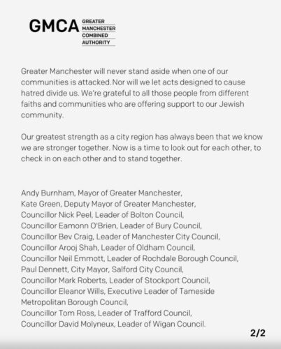 We are grateful to the Leaders of all ten Greater Manchester boroughs along with the Metro Mayor, Andy Burnham and Police and Crime Commissioner, Kate Green for their swift and unequivocal condemnation of the appalling terrorist attack targeting our community on Yom Kippur.