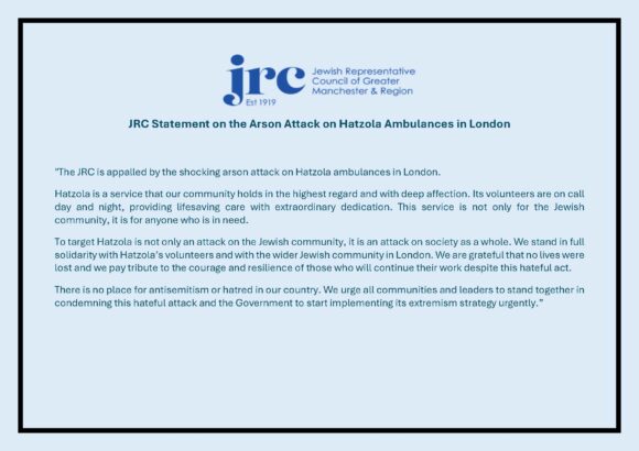 “The JRC is appalled by the shocking arson attack on Hatzola ambulances in London.