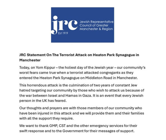 Yesterday, on Yom Kippur – the holiest day of the Jewish year – our community’s worst fears came true when a terrorist attacked congregants as they entered the Heaton Park Synagogue on Middleton Road in Manchester.